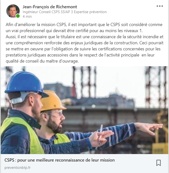 CSPS et livre Blanc 19 avril 2019 / securitetravail « Le CSPS un vrai professionnel » J-F de Richemont Ingénieur Conseil CSPS Pratique accessoire du droit Livre Blanc CSPS Partager :TweetJ’aime chargement… Similaire